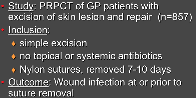 The primary outcome of the trial was the number of wound infections, which trended toward being less-frequent in the wet group (8.4% vs 8.9%). The authors stated that the “results indicate that patients can uncover and occasionally wet stitches in the first 48 hours after minor skin excisions without increasing the incidence of wound infection.”