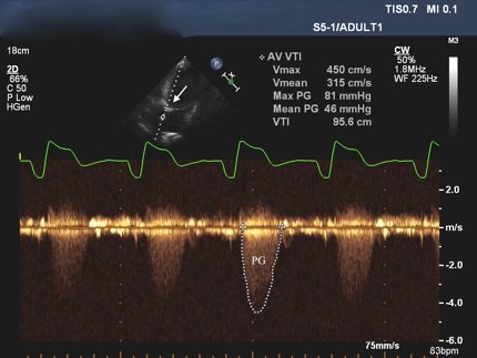 Figure 1. Echocardiogram showing a peak systolic gradient across the bioprosthetic aortic valve (arrow) of 81 mm Hg, a mean aortic gradient of 46 mm Hg, and an aortic valve area of less than 0.5 cm2.
