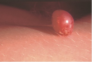 <p>This tumor has developed at the site of incidental trauma on this adolescent's forearm. The lesion is growing rapidly and bleeds profusely after minimal trauma.</p><p>What is...