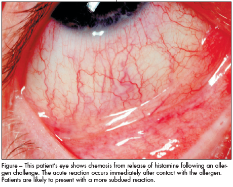 Signs and symptoms of a full-blown ocular allergic reaction include deep red vessels in the conjunctiva, itching, and swelling of the conjunctiva and eyelids.