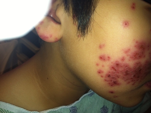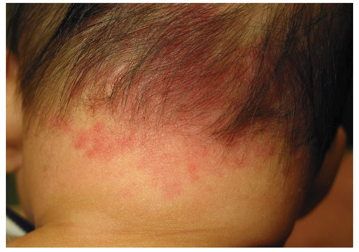 A 15-month-old girl with a history of poorly controlled atopic dermatitis presented with erythema and scattered lesions around her right eye. Four days before presentation, the child was noted to have 2...