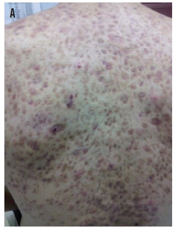 A 17-year-old male presented to the emergency department with a complaint of back, chest, and right hip pain of 6 weeks’ duration, as well as severe acne that was refractory treatment.