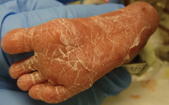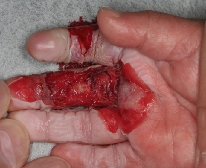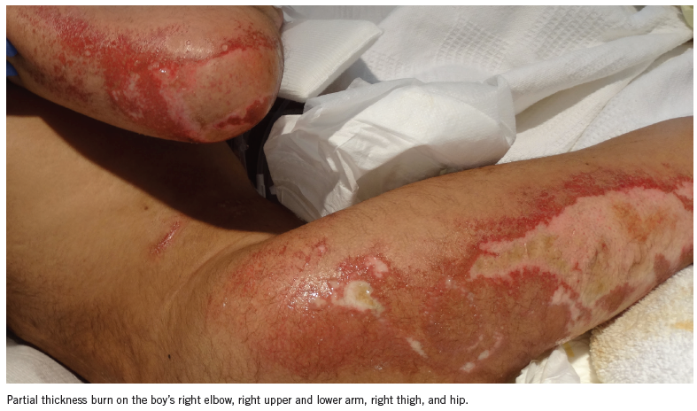 A previously healthy 11-month-old boy presented to our hospital with a steam burn from a rice cooker on his 4 right fingers and part of the ventral palm.