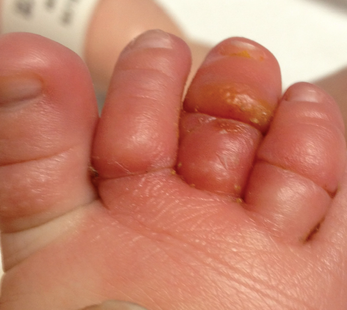 A 2-month-old girl who had been born at term and who had no past medical history presented to the emergency department (ED) with a hair tourniquet and suspected infection on her right second, third, and...