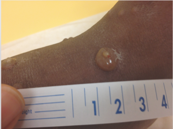 Two days before presenting to his primary care pediatrician, a previously well, 27-month-old boy had developed a solitary papule below his left eye.