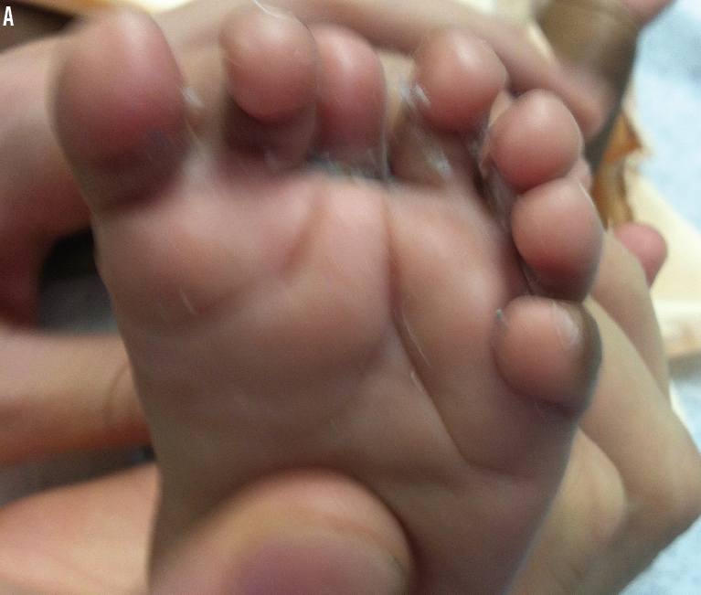 On physical examination, the newborn was noted to have 7 toes on the left foot (A). The rest of the examination findings were unremarkable. The patient was referred to orthopedics for further evaluation.