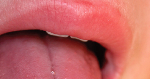 A 6-year-old girl presented with a 1-year history of verrucous papules on the lips and oral mucosa extending to the surrounding skin, consistent with HPV infection.