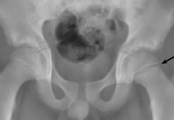 A 12-year-old boy presented to the orthopedic clinic with left hip pain that began after he was tackled at a school football game.