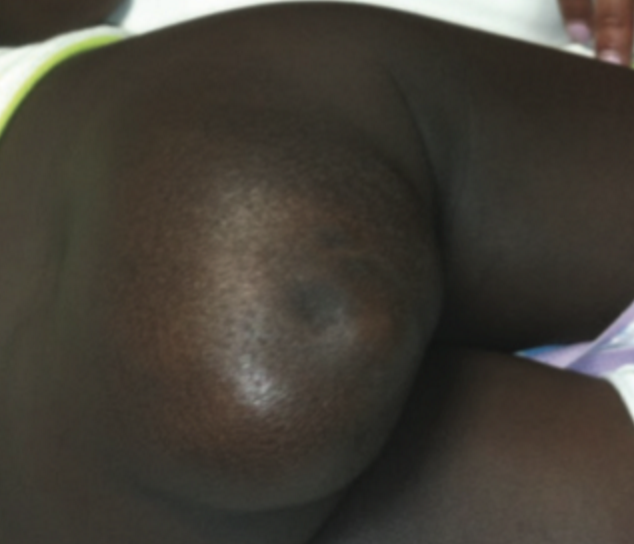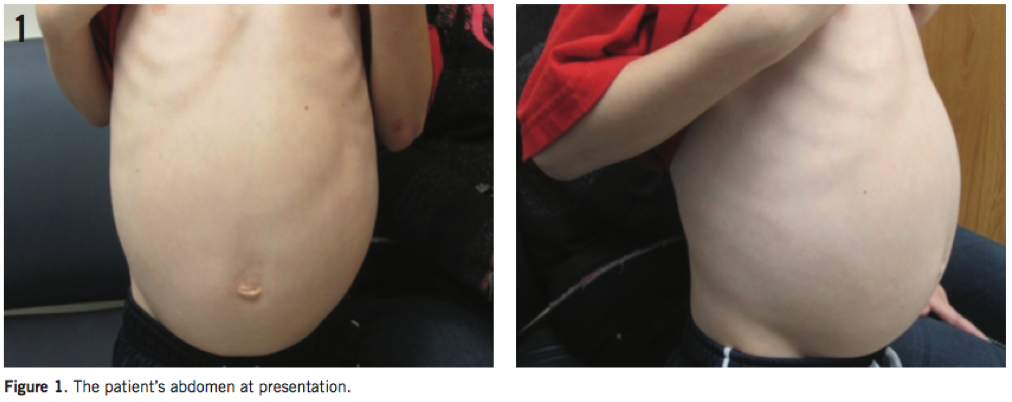An 8-year-old boy presented to his pediatrician with a grossly enlarged abdomen and a several-month history of worsening abdominal pain, tightness, and discomfort, but with no nausea or vomiting.