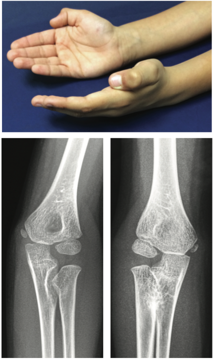 A 7-year-old boy was brought to the office by his mother because he was unable to fully turn the palm of either hand into the flattened, or supinated, position.