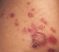 <p>The numerous superficial, rounded, red-based ulcerations on the left buttock of a 3-year-old girl are characteristic of bullous impetigo. The...