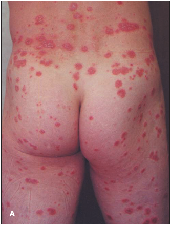 A 13-year-old boy presented with an explosive eruption of numerous, small, round, erythematous, itchy plaques on his lower back and lower limbs of 2 weeks' duration (A).