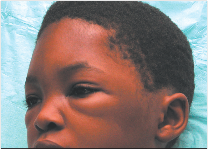 For several days,a 9-year-boy has had painful swelling on the top and left side of his forehead, bilateral eye swelling, intermittent fever, and nasal congestion.