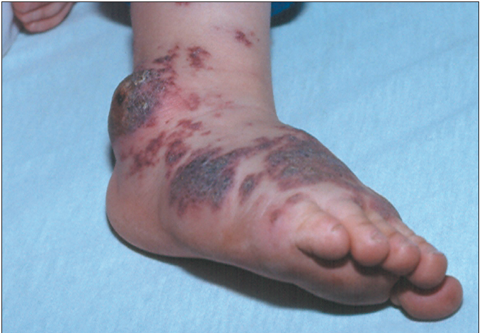 The parents of this 2-year-old boy brought their son for evaluation of swelling of the right leg and excoriation and serosanguineous discharge from the ankle region of 3 days' duration.