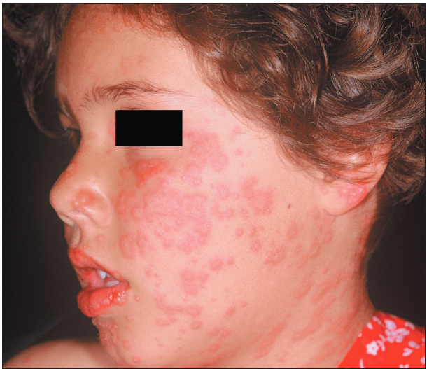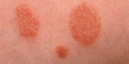 A5-year-old boy, who lives on a farm and routinely plays with his pet dogs, presented with these scaly, inflamed macules with a central clearingon the abdomen (A) and forehead.