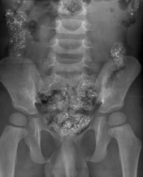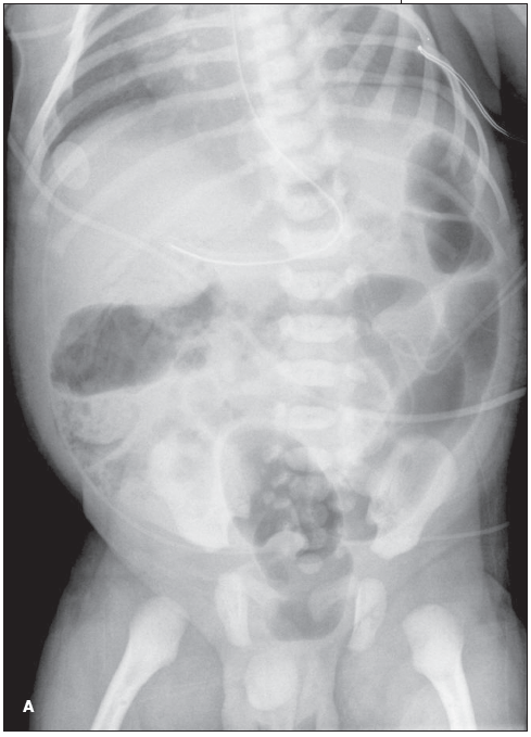 A 30-hour-old boy--born to a 36-year-old gravida 3, para 3, at full term via a spontaneous vaginal delivery--was noted to a have a mildly distended abdomen while in the newborn nursery.