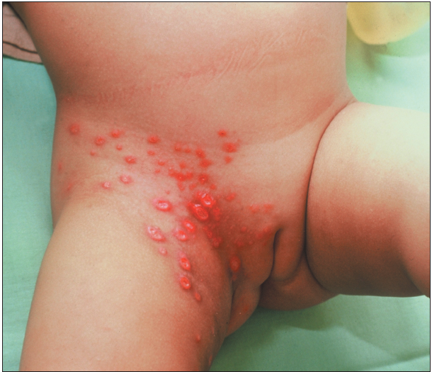 Seven-year-old girl with generalized rash that started as a single isolated oval lesion on the lower abdomen (A). Six days later, diffuse papulosquamous lesions appeared mainly on the trunk (B), sparing the...