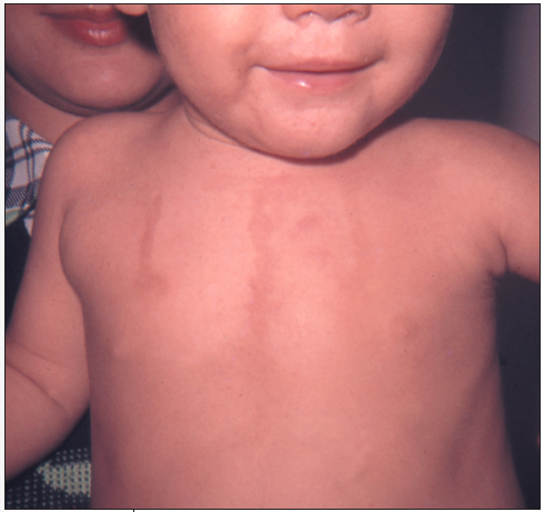 The mother of a young child was concerned about these hyperpigmented streaks that had appeared on her son's upper chest during the previous 2 weeks.