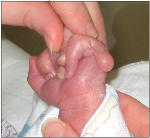 This baby was born with an ulnar supernumerary digit on the left hand. This common congenital anomaly can be an isolated malformation or associated with other syndromes at birth.