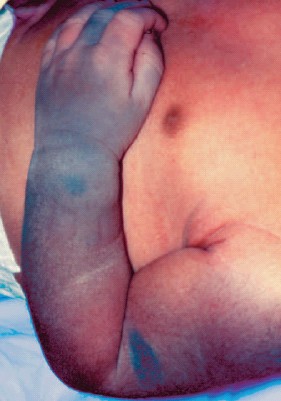 The bluish gray skin coloration of the left upper extremity, including the thumb and middle finger, and on the right buttock in a full-term, African American, newborn girl is...