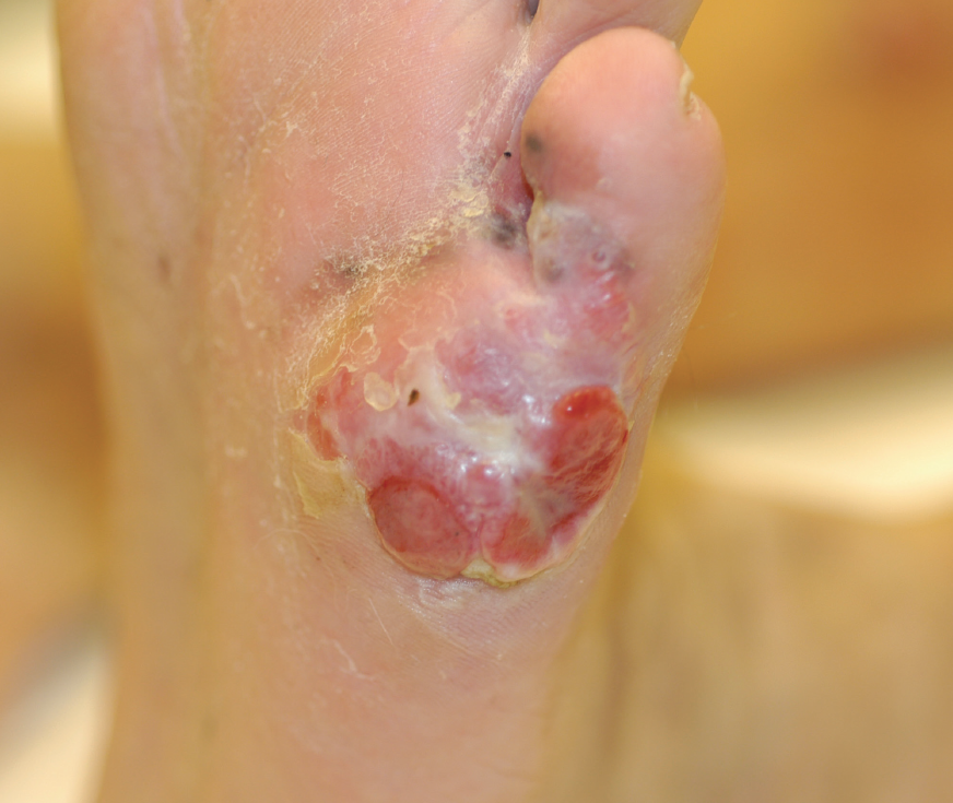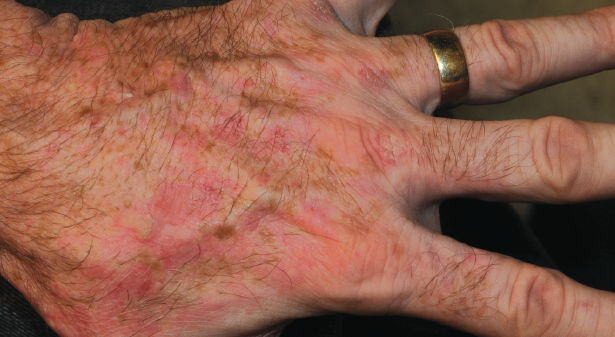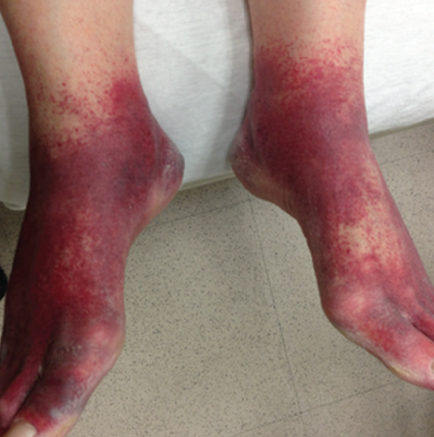 A 74-year-old female with a history of polymyalgia rheumatica and hypertension presented with bilateral foot and hand rash that developed over two days.
