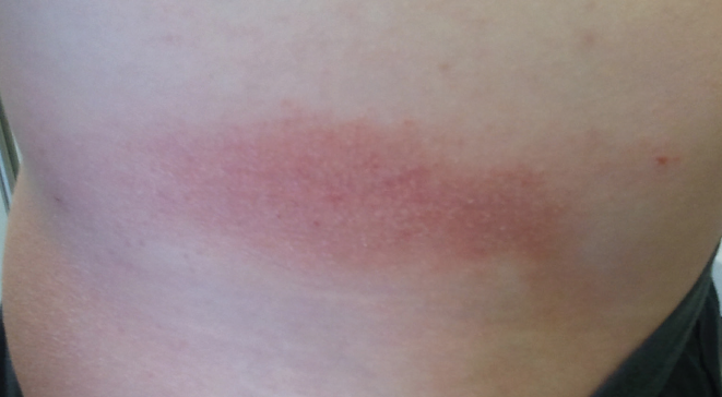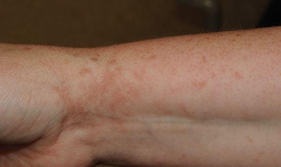This 47-year-old female presented for evaluation of an asymptomatic pigmented eruption on her volar right wrist of only a 4 week duration. She denies any new exposure history.