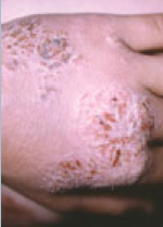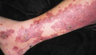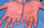 A 62-year-old man presents with a violaceous, nonpruritic eruption that arose 2 weeks earlier on the hands and feet, including the palms and soles, and spread to the arms and legs.