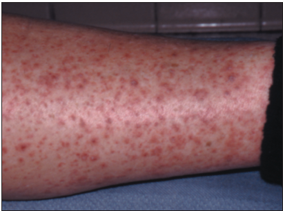 The parents of this 2-year-old boy brought their son for evaluation of swelling of the right leg and excoriation and serosanguineous discharge from the ankle region of 3 days’ duration.