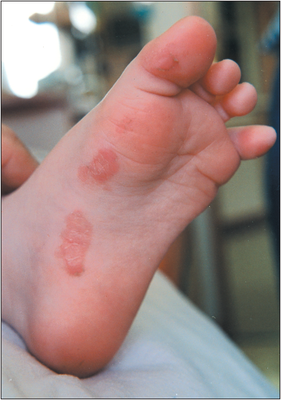 A 3-year-old girl discovered lesions on her instep and great toe, where there was significant pressure from the old rubber sandals that she had been wearing.