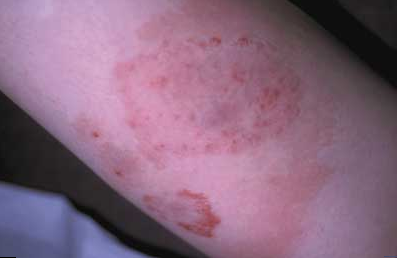 A 20-year-old woman presents with a 3-week history of a pruritic, progressively enlarging erythematous lesion on one arm. She has a cat and recently started horseback riding lessons. She is otherwise...