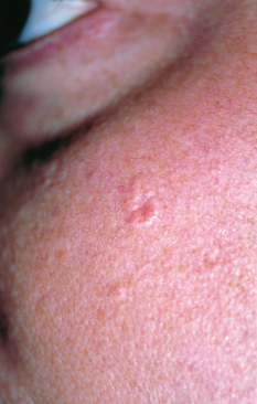 <p>A 53-year-old woman is concerned about this asymptomatic, slow-growing lesion on her left cheek, which she first noticed a few months ago. She denies bleeding or pain.</p>
