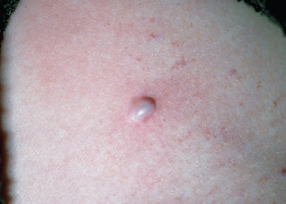 <p>A 50-year-old woman is concerned about a persistent white papule that erupted on her chest a few months ago. The lesion is asymptomatic.</p>