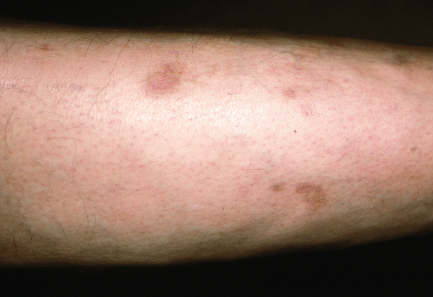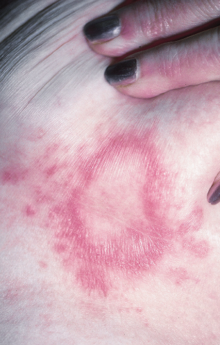 For 2 months, a pruritic rash had been present on the upper back of a 48-year-old woman with a 1-year history of chronic myelogenous leukemia and a 2-year history of hepatitis C.