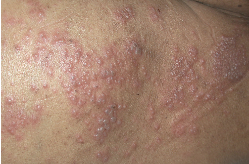 This 62-year-old female has been on etanercept for over 1 year for treatment of psoriasis and presents with a tender eruption of three days duration on her right arm.