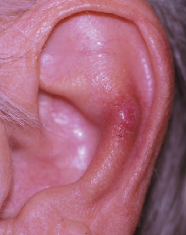 A 58-year-old female’s right ear shows a 0.5 cm diameter skin-colored nodular lesion with a central dry white top on the antitragus. She had noticed the lesion 1 month prior. It was asymptomatic.
