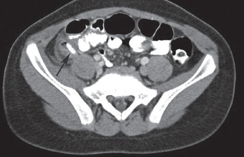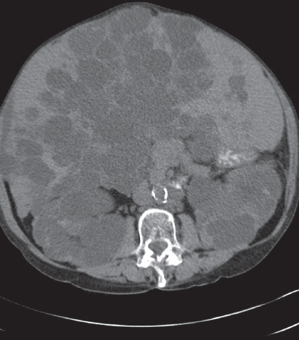 A 43-year old female with a history of autosomal dominant polycystic kidney disease (ADPKD) presented to the emergency room with a gradual onset of right upper quadrant abdominal pain for the past 7 days.