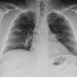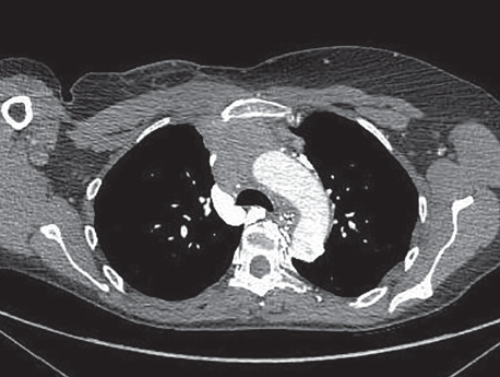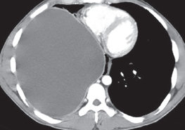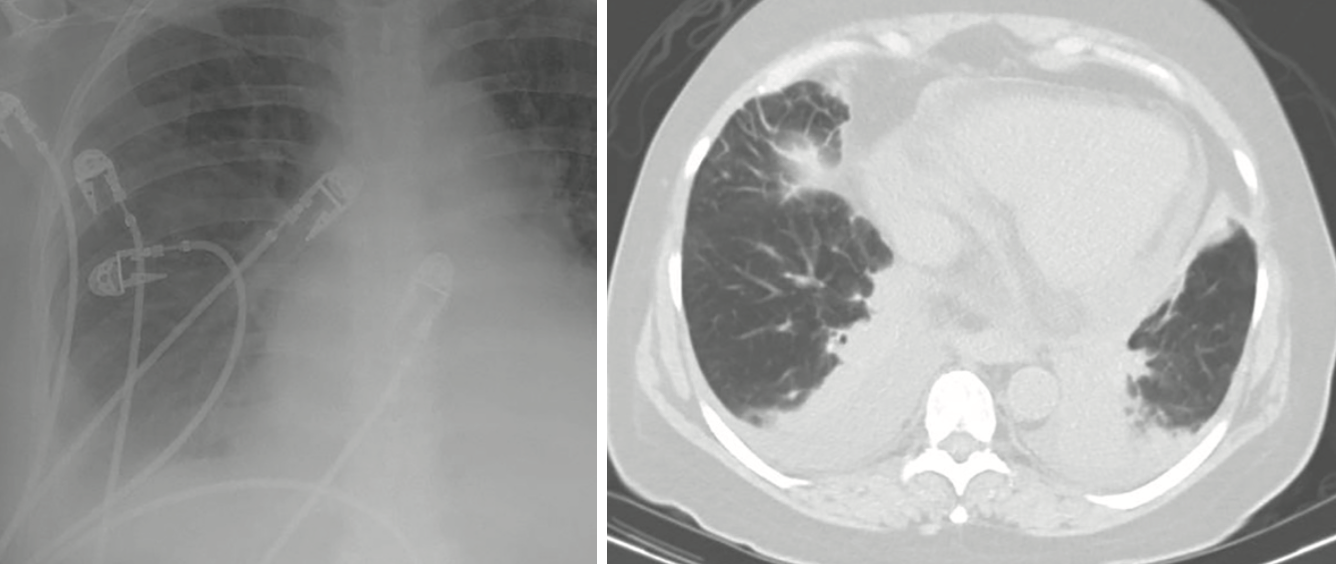 A 55-year-old female with history of triple negative breast cancer stage IIA status presents with pleuritic right-sided pain in the infrascapular region with progressive dyspnea on exertion over the past 2...