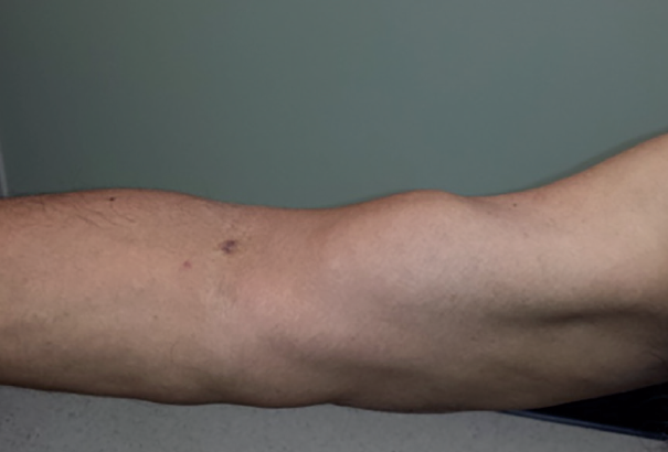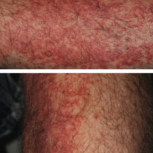 A 46-year-old female with a history of eczema presents with a 2-month history over the summer of itching on her arms, mostly in a sun distributed pattern.