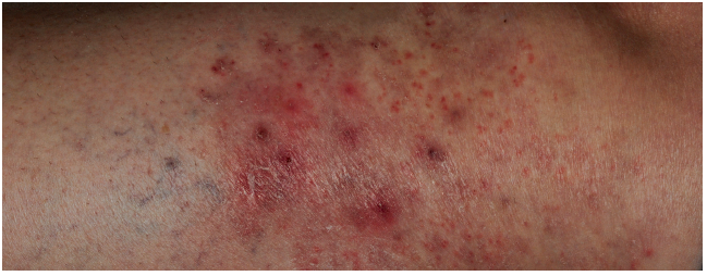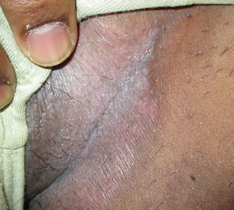A 23-year-old African American female presented with a 5-month history of a pruritic eruption confined to the abdomen that developed while she was living in Africa.