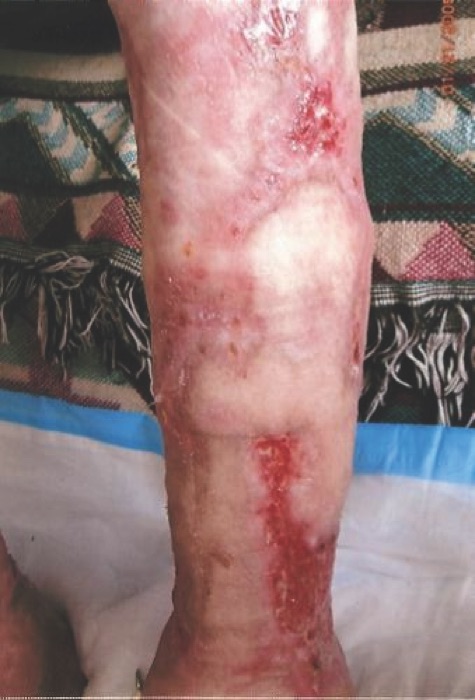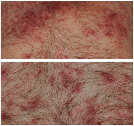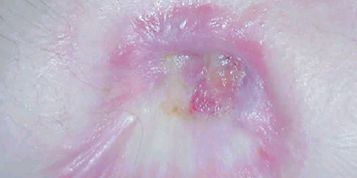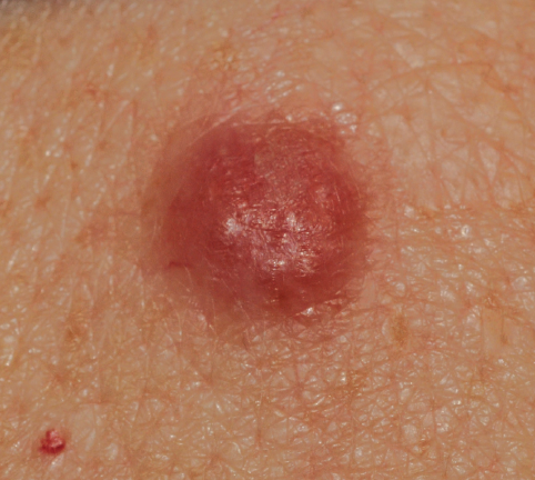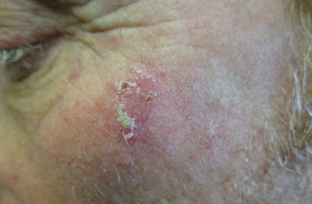 A 67-year-old Caucasian male presented with a red scaly plaque on his left cheek. The patient reported that the lesion was first noted about 2 years ago and slowly increased in size with time.