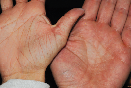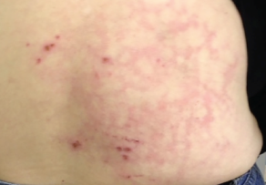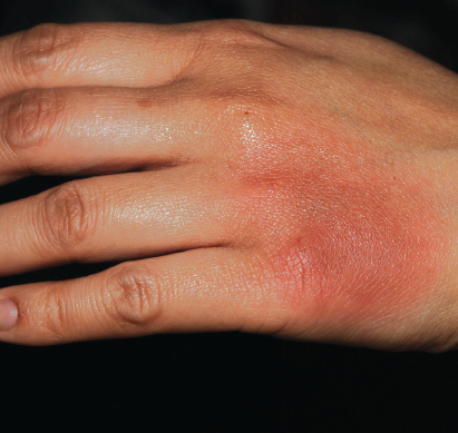 A 40-year-old female developed a rash on one hand that was tender to touch. She had started on doxycycline the day prior to treat an upper respiratory infection. There is no history of trauma or exposure...