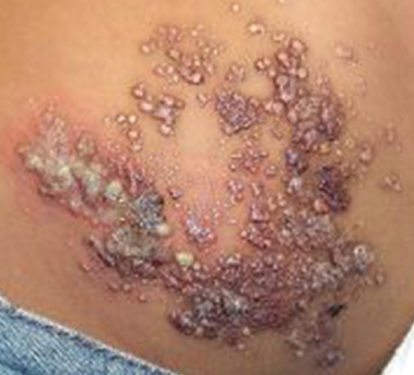 A 6-year-old boy had redness and pain of skin on his left upper abdomen for the past 3 days. Physical examination revealed a large cluster of vesicles with underlying erythema and mild warmth.