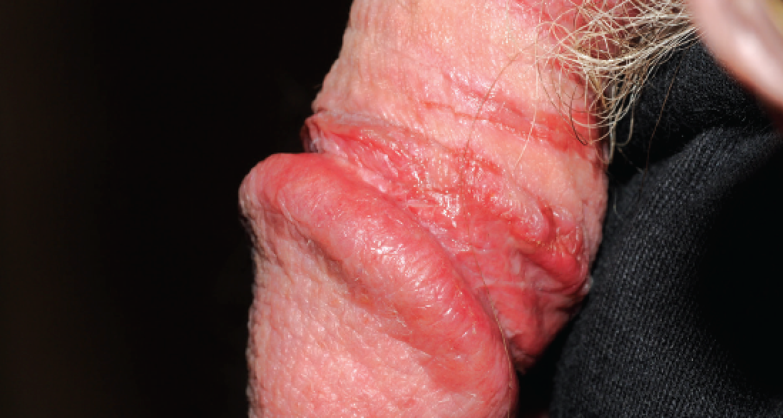 This 77-year-old man presented for evaluation of painful erosive dermatitis on his penis. He initially was believed to have an infection and was given cephalexin.