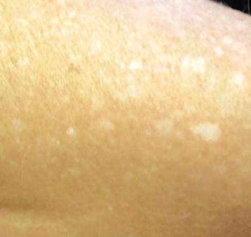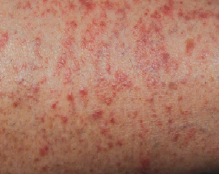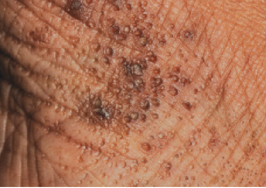 This 50-year-old woman presented with a several-year history of annoying but painless lesions on the insteps of the soles, wrists, and creases of her palms.