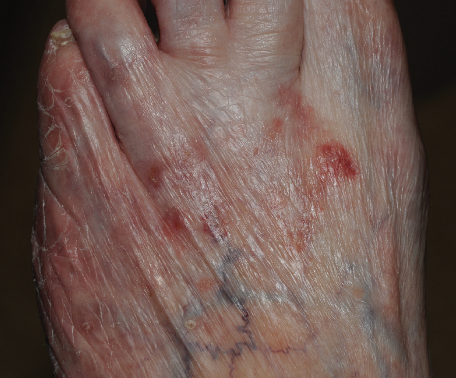 Child with asymptomatic, flat, papular eruption appearing on the extremities is consistent with Gianotti-Crosti syndrome, or papular acrodermatitis of childhood.