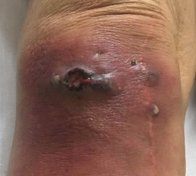 An 82-year-old man presented with a 6-year history of scalp lesions, which consisted of recurrent pustules, thick yellow-brown crusts, and inflamed eroded plaques overlying a healed graft site.