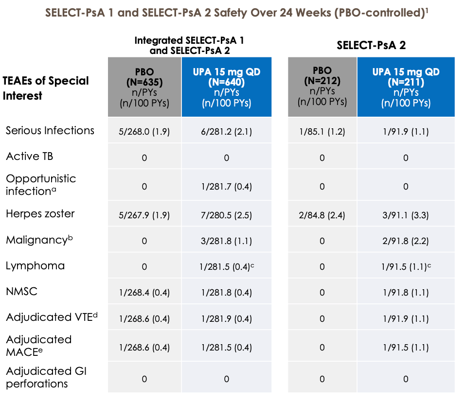 eIn the UPA 15 mg arm of SELECT-PsA 2, one event of abnormal lymphocyte morphology was reported in the 24-week analysis and two events in the 56-week analysis; per investigators, no further diagnoses were made.