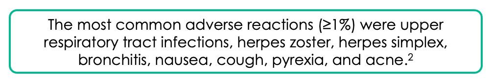 The most common adverse reactions (≥1%) in patients treated with upadacitinib were upper respiratory tract infections, herpes zoster, herpes simplex, bronchitis, nausea, cough, pyrexia, and acne.