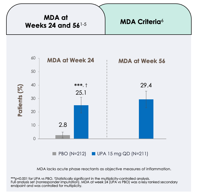 IN SELECT-PSA 2 (BDMARD-IR), A SIGNIFICANTLY GREATER PROPORTION OF PATIENTS ACHIEVED MINIMAL DISEASE ACTIVITY AT WEEK 24 WHEN TREATED WITH UPA 15 MG VS PBO