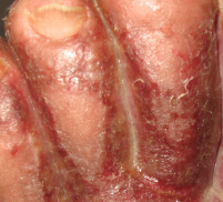These painful eczematous lesions at the angle of the mouth and the base of the nostrils had been present in a 52-year-old woman for 3 days.